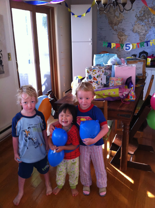 Birthday party was themed knights & princesses. Began with decorating shields, followed by knights' training, slaying of the balloon dragon, decorating the castle cake, swimming the moat, etc, etc. Fun was had by all. No tears at a 5 year-old party?